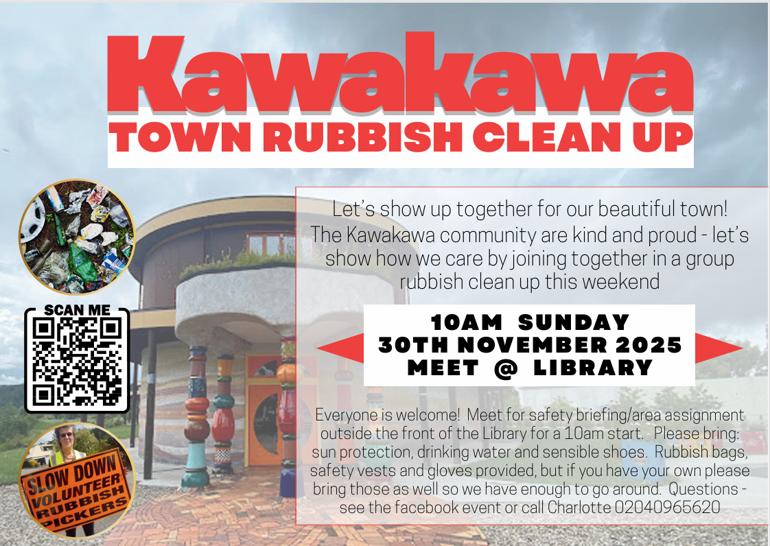 30 November 2025 @ 10:00 am - 2:00 pm Kawakawa Town Clean Up Kawakawa Library If you haven't been there before, there is loads of parking outside the library, just follow the little road next to the Bay of Islands Vets, and it will take you behind the Hunderwasser toilets to the library and parking. 10am will be safety briefing and dividing (hopefully lots of) volunteers into assigned areas. I hope […]