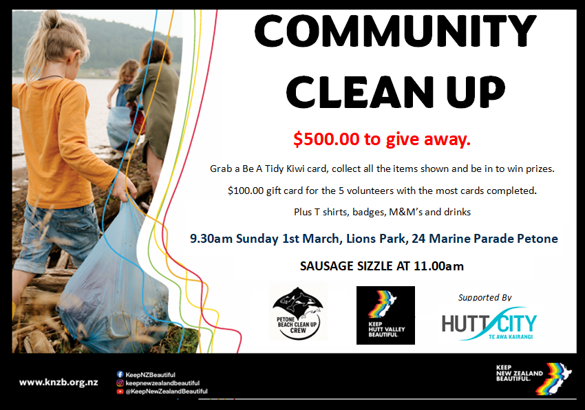 March 1 @ 9:30 am - 12:00 pm Community Clean Up Lions Park 24 Marine Parade, Petone, New Zealand Everything will be supplied. We just need you!